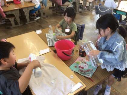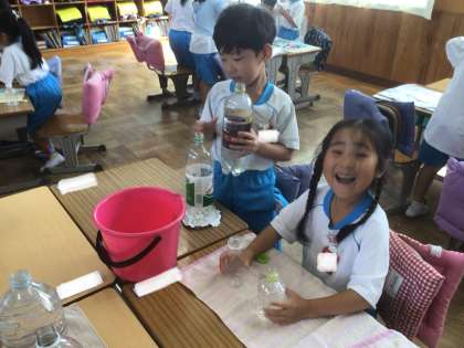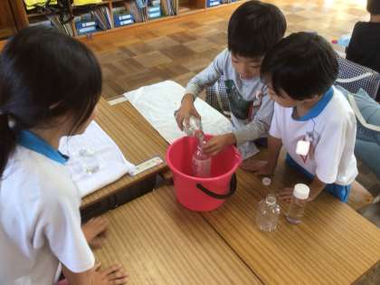 「おおきさきらべ」の学習です。今日は、自分でもってきた容器を使って水を入れて比べっこをしました。みんな、とっても楽しそうです。