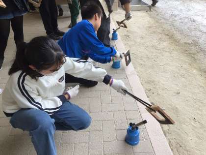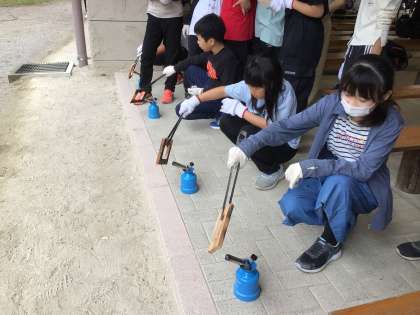 まずは、バーナーで木枠をあぶり、木の風合いを出します。
