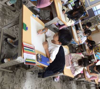 図工「お話から生まれたよ」の学習で、お話を聞いて頭に浮かぶ場面やイメージを下がきしています。