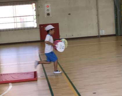 学級レクを行いました。うちわで挟んだボールを持ちながら障害物を乗り越えます。うちわで運ぶのがなかなか難しかったですが、持ち方やすぴを工夫して次の子へボールをつなぎました。