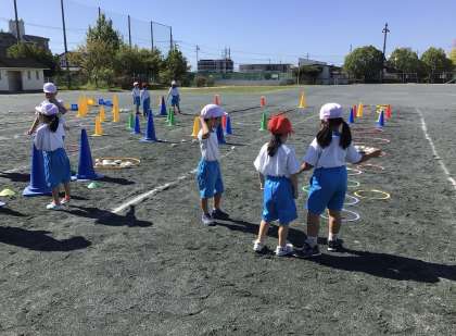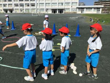 輪っかや、ロープなどを思い思いに置いて、自分たちでルールを考えて、障害物競走をしました。