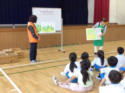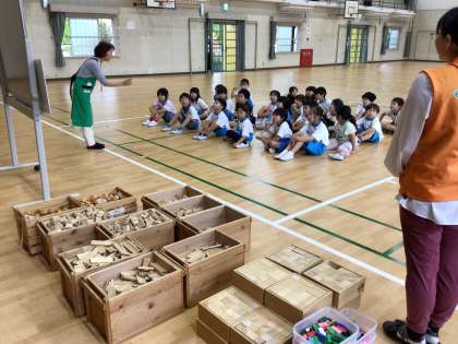 エコットさんが、間伐材でできた積み木を持ってきてくれました。間伐について教えてもらったあと、お待ちかねの積み木遊びです!!