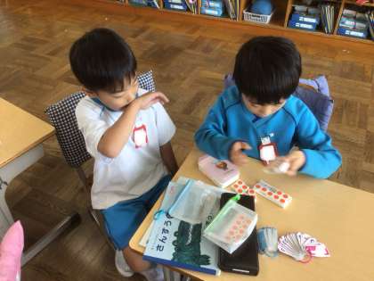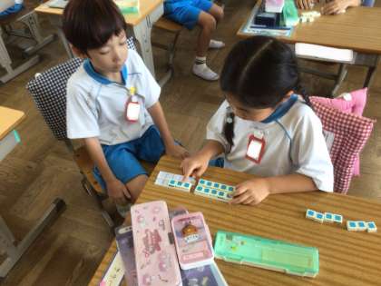 「たしざん」の学習です。数が大きくなり、どうやって計算するのか、数図ブロックを使いながら友だちに説明をしました。