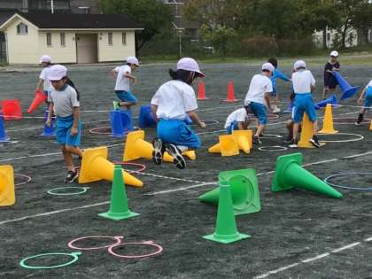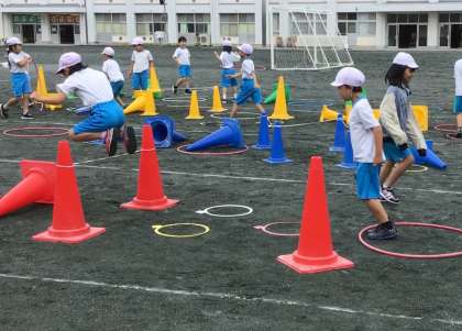 フラフープやコーンを使って、自分たちでコースを作ります。試しに跳んでみて、また作り直したり、調整したりします。