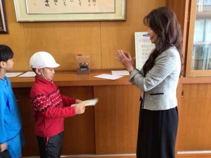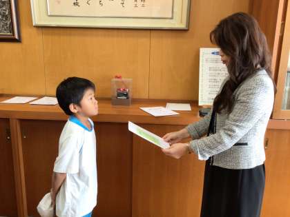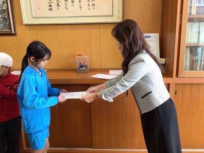 校長室にて校長先生よりかがやき賞をいただきました。
