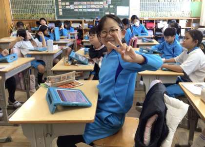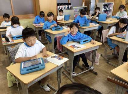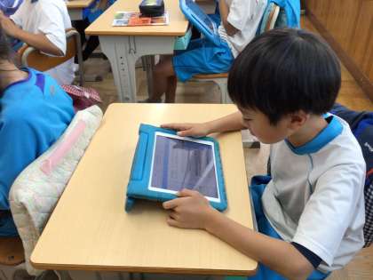 学習用タブレットを使って枝垂れ用水についての練習問題に取り組んでいました。練習問題に正解した4年生は素敵な笑顔でした。