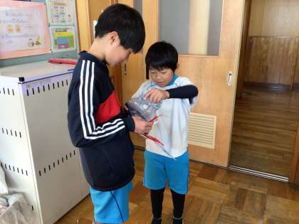 SDGs委員会の6年生が教室に来て赤い羽根共同募金の呼びかけに来ました。