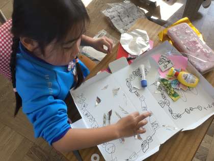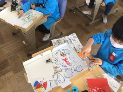 すごろく作りでは、お話を考えながら作っています。途中で、誰に出会う?どこに寄る?など工夫しています。