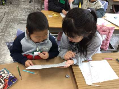 国語の学習「本の中の友だち」で、友達になってみたい登場人物を選び、カードに書きましたが。それを友達同士で読み合っています。
