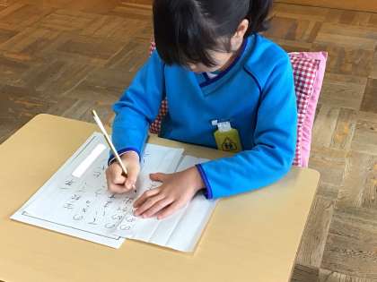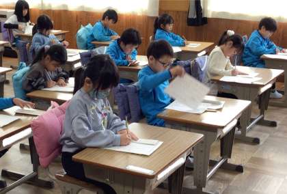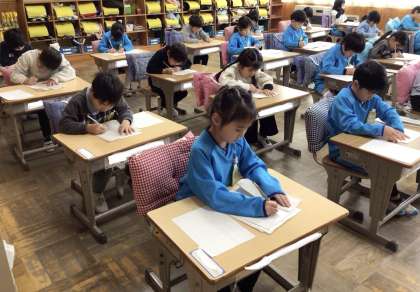 初めての書き初め大会。お手本をよく見て、一文字ずつ、一画ずつ、丁寧に書こうと真剣な様子でした。4月の頃と比べると、どの子も字形を整えて書くことができるようになりました。来年も、頑張ってください。