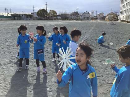 寒い季節ですが、北風と仲良く遊びましょう。この日は、かざぐるま・かざわ・かさぶくろロケットを作って遊びました。思うように動かないのは、なぜだろう?どうすればもっとよく動くのだろう?と遊びながら考えました。