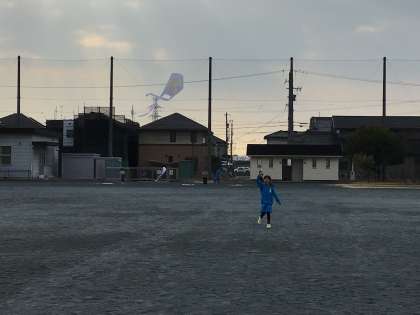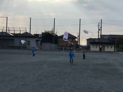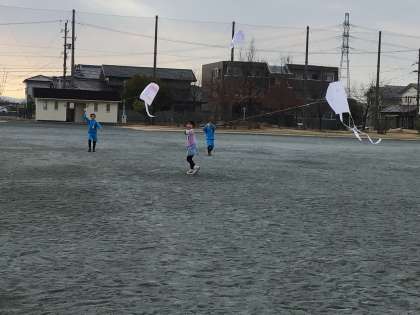 北風と楽しく遊ぶために、凧を作り、運動場で揚げました。「上がった、上がった!!」と、子どもたちは大喜びでした。冬空に、子どもたちの描いた絵が映えます。今度は、もう少し糸を長くして揚げてみたいですね。