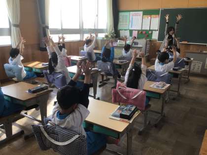 今日のスタートは、書写体操です。しっかり体や指先までほぐしてから、始めました。