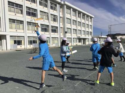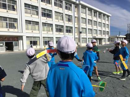 4年生が、図工で作った飛行機を運動場で飛ばしました。