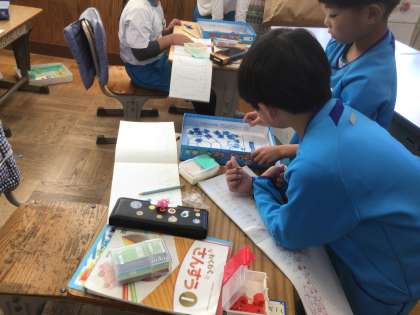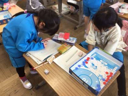 おはじきを飛ばして、友だちと点取りゲームを楽しみました。点数を計算して、くらべっこです。