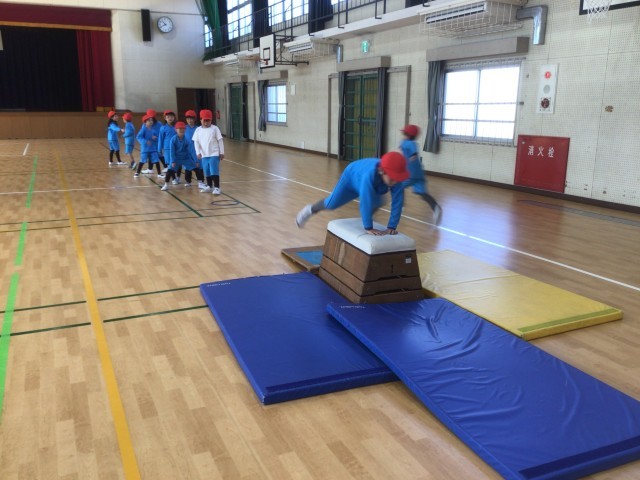 みんな、何回も何回も挑戦しました。手を遠くに着き、足を大きく開いてとびました。