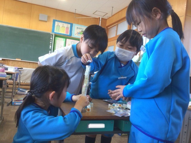 算数セットに入っているブロックを、久しぶりに触りました。少しなつかしくも感じながら、グループで高く積む遊びをして楽しみました。