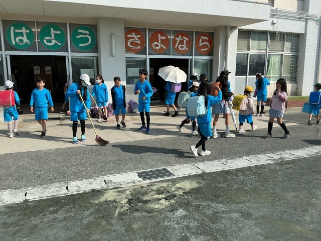 今朝も元気よく挨拶ボランティアを行いました。挨拶だけでなく掃除をしている5年生もいます。