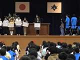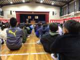 書き初め展の表彰も行われました。最後に、春休みの過ごし方についての話を聞きました...