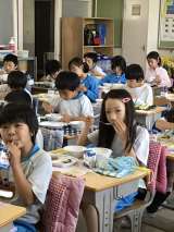 給食中の風景です。おしゃべりしながら食べることはできませんが、おいしい給食に大...