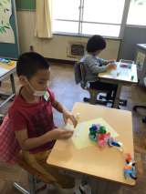 七夕飾りを作っています。今年は笹の葉も絵の具を使って作りました。少しずつ飾りが増...