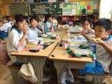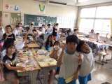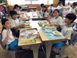 昼の校内放送のクイズを班で考えながら食べていました。大いに盛り上がっていました。