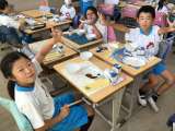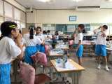 3組も糸電話を使って実験を行いました。糸にスパンコールを通して、声を出したいとき...