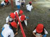 ボールを体にはさみ、作ったコースを工夫しながら走りました。腕を組んだり、肩をもっ...