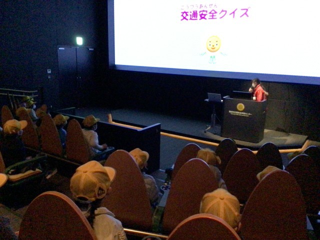 最初はシアターで交通安全に関するクイズにチャレンジしました!横断歩道の渡り方しっ...