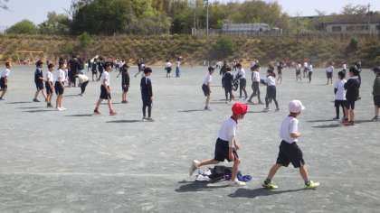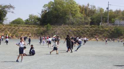 お天気がよいので、休み時間にはたくさんの子どもが、外で元気よく遊んでいます。子どもと一緒になって遊ぶ教員もいます。