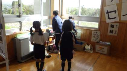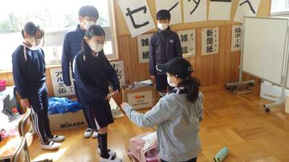 校内に2か所、リサイクルセンターがあります。一つは駐車場の角の倉庫、もう一つは校内の昇降口を入って東のつきあたりです。外の倉庫の方には、車で保護者や地域の方々が資源を運び入れてくださいます。資源を家から持ってきてくれた子どもたちは、昇降口を入ってすぐ、校内のリサイクルセンターに持ってきてくれます。