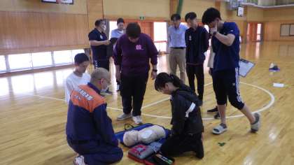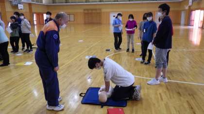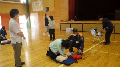 子どもたちの下校後、緊急対応訓練を行いました。豊田市の消防署の方にお越しいただき、第一部は、心肺蘇生やAEDの使い方を確認しました。参加を希望された保護者と教職員が一緒になって、模型を使って練習をしました。