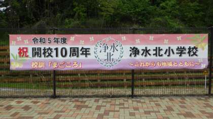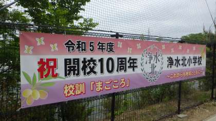少し前から、10周年の横断幕を掲げています。正門の前と北門入ってすぐの校内の横断歩道のところです。子どもたち、保護者・地域の方々の目にいつも触れるようにして、この1年間掲げていきたいと思います。デザインは実行委員会で考えました。「目立っていいね。」「立派な横断幕ですね。」「上品な色合いだね。」と好評です。