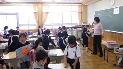1年生の図工の授業の様子です。「好きな色や形で、こんなお日様がいいなと思うお日様を大きく描こう」という活動でした。にこにこ笑顔のお日様や、カラフルなお日様を「見て。見て。」と見せてくれました。