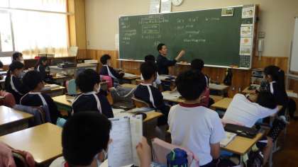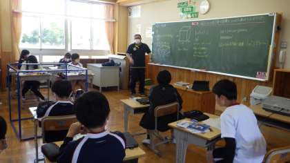 5年生の算数の授業です。今まで習ったことを使って、一辺が1メートルの立方体の単位が1立方メートルであることを考えました。少人数での授業です。