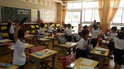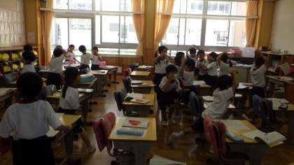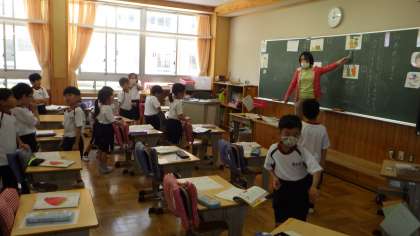 1年生の国語の授業です。「雨ですよ」の物語を、人物になりきって体でも表現しながら読んでいました。