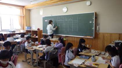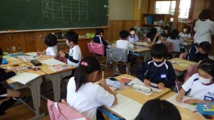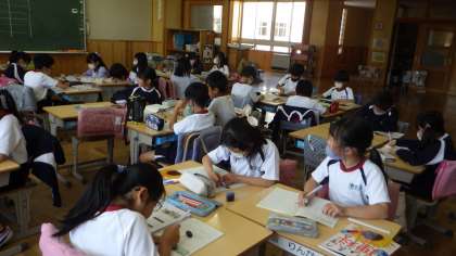 3年生の理科の授業です。ヒマワリ、ホウセンカ、ダイズ、オクラの4種類の種を比べて、大きさ、色、形についてまとめていました。
