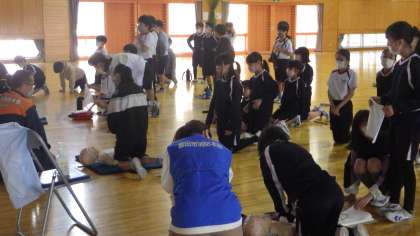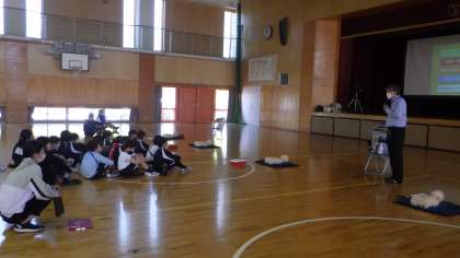 消防本部の方々にお越しいただき、5年生が応急手当講習を受けました。AEDの大切さについての動画を視聴した後、胸骨圧迫やAEDの練習を行いました。