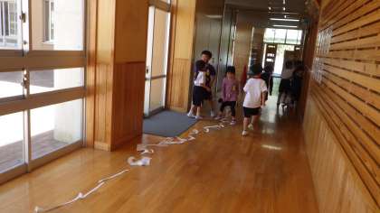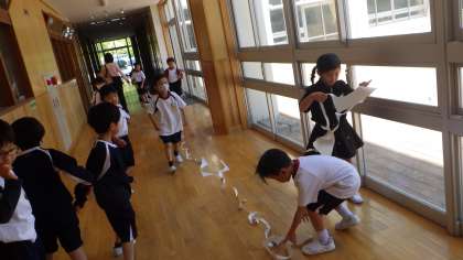 5/10 ちょきちょき 1年生 その2 公開日 2023/05/11 更新日 2023/05/11 各学年から はさみで切った物を、子どもたちのアイデアでつなぐことにしたそうです。「校長先生にも見せてあげたい。」と言ってくれたそうで、見にいくと、教室からメディアセンターを超えるぐらい長い紙に。友達と声を掛けあって活動し、とても楽しそうでした。遊びを考えついた子どもたち、一緒に楽しんでいる先生に拍手。 1年