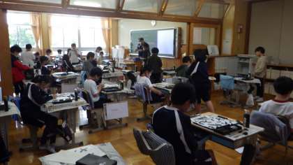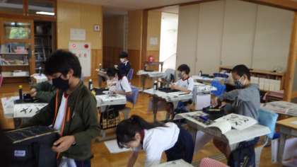 5年生の書写の授業です。「ふるさと」という字を書いていました。前回同じ字を練習して、その作品を学習用タブレットで写真に撮っていました。それとお手本を比べ、自分の課題を見つけ、そこを意識して練習していました。