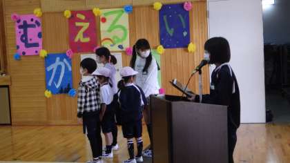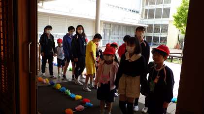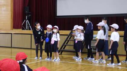6年生が準備をしてきた「1年生を迎える会」。1年生の入場は、グループのお兄さん、お姉さんと一緒に。一人ずつ名前を呼ばれ、紹介されました。1年生を迎える全校の雰囲気がとても温かく、笑顔にあふれていました。