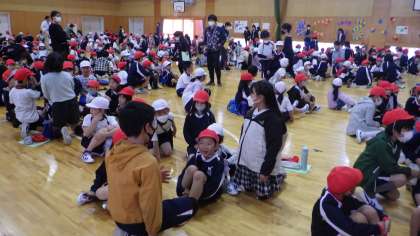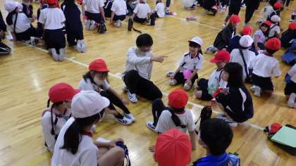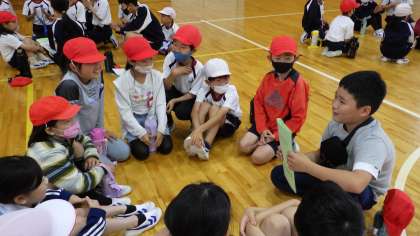 はじまりの会のあと、グループで自己紹介の時間です。これから楽しい遊びをしていく「わくわく班」の第1回の活動です。6年生の示してくれた自己紹介の仕方にのっとって、一人ずつ自己紹介をしました。