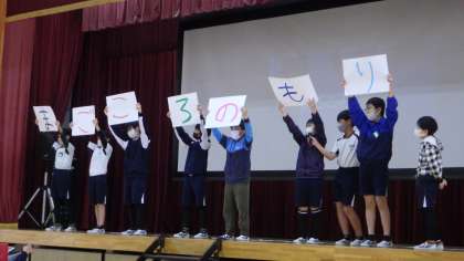 学校クイズです。1年生の担任の先生に関する〇×クイズ、学校の場所に関する並べ替えクイズなど。周りの子とわあわあ言いながら答えを考えました。ヒントをもらって、1年生も楽しそうに活動していました。10周年に関するクイズもありました。
