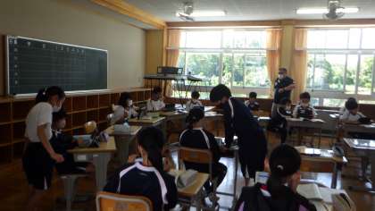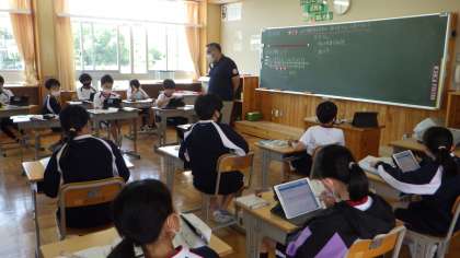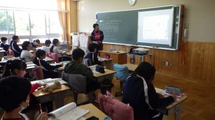 5年生の算数の授業です。「比例」について学習しました。学級を二つに分け、少人数で指導しています。自分の考えやわからないところを、近くの席の子と話し合っていました。