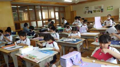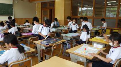 4年生の図工です。前回、いろいろな技法を試しながら作った作品を、好きな形に切り取り、画用紙に配置したあと、絵具を使って、模様を付けたり、色を塗ったりして一つの作品にしました。