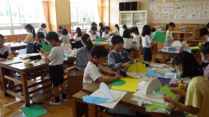 3年生の図工です。円形の画用紙がくるくる回る仕組みを使って、その動きにあった物を考え、作っていました。