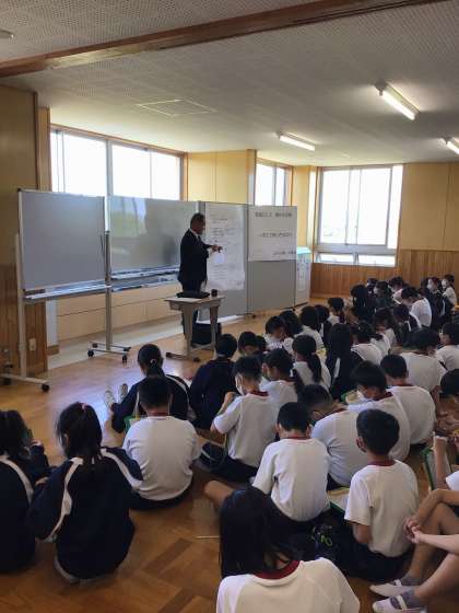 5年生の総合的な学習の時間です。講師に初代の校長先生を招き、浄水北小学校の特色についてお話していただきました。5年生は、10周年記念の「浄水北カルタ」を作るので、学校や地域の自慢・特色をたくさん探したいのです。お話の後、初代校長先生を質問攻めにしていました。