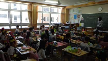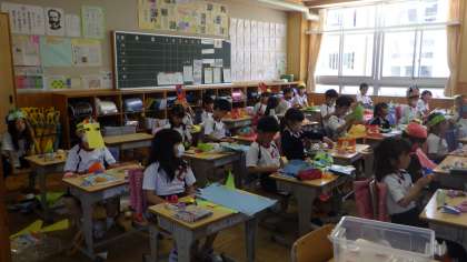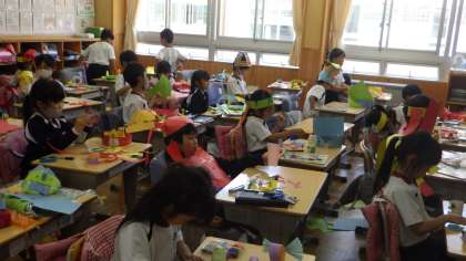 5/24 わっかで変身 2年生 公開日 2023/05/25 更新日 2023/05/25 各学年から 2年生の図工の授業です。色画用紙を使ってお面や全身の飾りを作っていました。作り終えた帽子をかぶったままベルトを作ったり、フル装備をした姿を見せ合ったりしていました。 2年