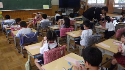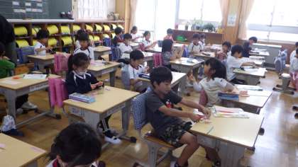 1年生の図工の様子です。ちょきちょき飾りを作るための試しの時間でした。試しの紙を折ってから切り、同じ形が連続している物にするには、どのように切ったらよいか、考えながら切っていました。