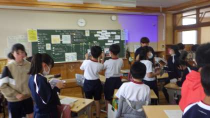 自分が登場人物ならどうするか。「言う・言わない」の線上に自分の気持ちを記して、理由とともに発表をしました。また、「自由とは何か」を10文字でまとめて書いた物を黒板に貼り、分類をしていきました。しっかり心と頭を使って考えていました。授業後、黒板を学習用タブレットで写真を撮り、記録する児童の姿がありました。